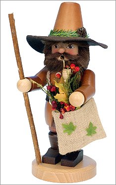 The Ulbricht Herb Gatherer Incense Smoker stands 12 inches tall and is hand-crafted in Germany and done in the natural wood finish. He carries a bag full of colorful herbs and a staff.