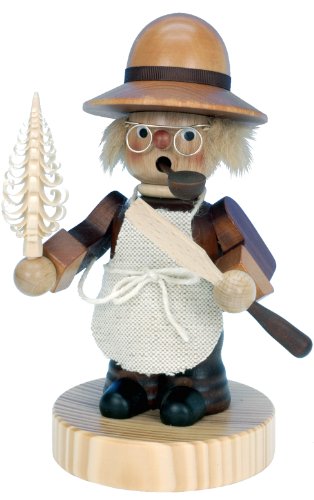 The Ulbricht Woodcarver Incense Smoker stands 8.5 inches tall and is hand-crafted and painted in Germany. He is holding a tree and an awl. Done in the natural wood finish, he is a beautiful piece.
